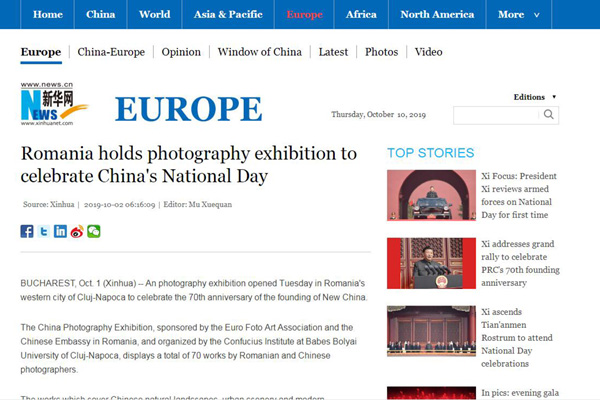 An photography exhibition opened Tuesday in Romania's western city of Cluj-Napoca to celebrate the 70th anniversary of the founding of New China.