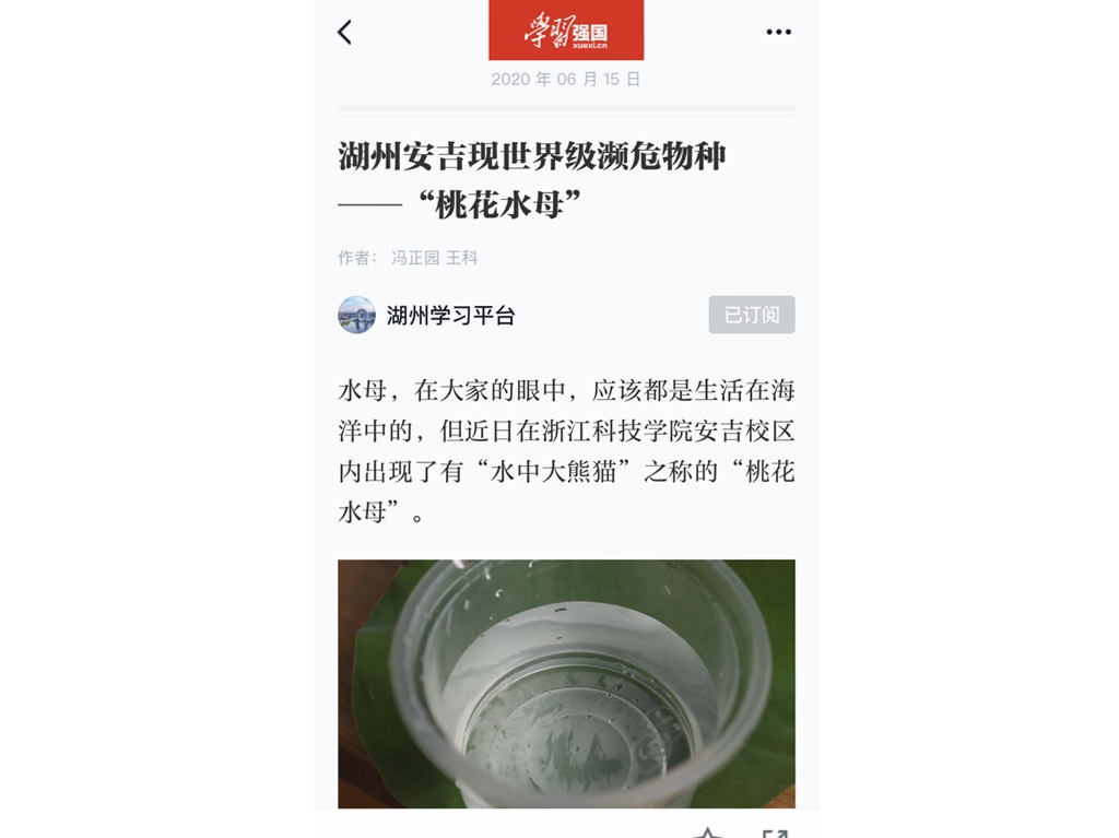 学习强国:湖州安吉现世界级濒危物种——“桃花水母”
