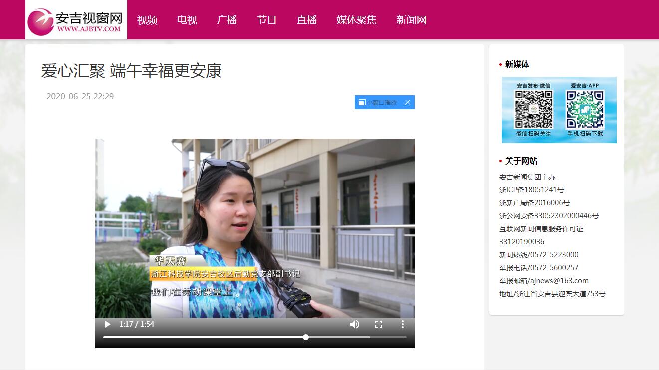 端午节,安吉校区志愿者在天子湖镇福利院开展端午“粽”情相伴活动。安吉县媒体对活动进行了报道。