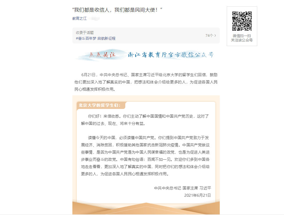 6月21日,中共中央总书记、国家主席习近平给北京大学的留学生们回信,鼓励他们更加深入地了解真实的中国,把想法和体会介绍给更多的人,为促进各国人民民心相通发挥积极作用。