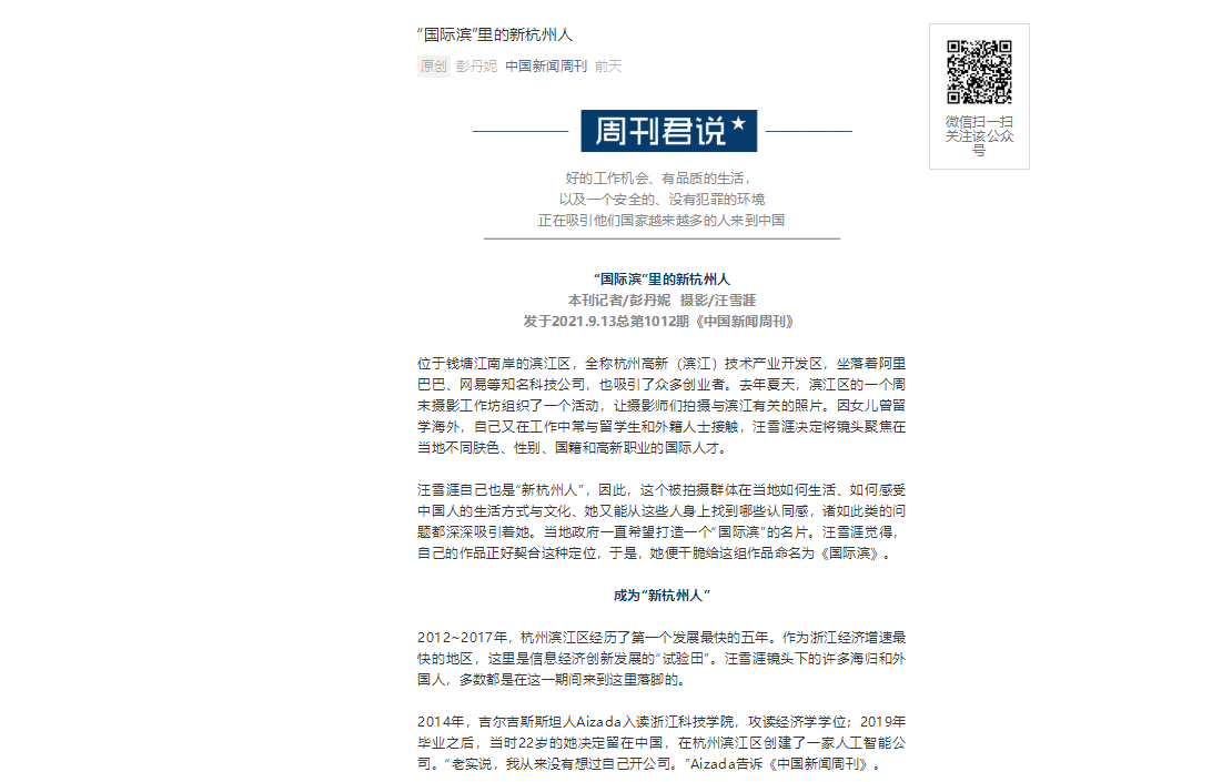 位于钱塘江南岸的滨江区,全称杭州高新(滨江)技术产业开发区,坐落着阿里巴巴、网易等知名科技公司,也吸引了众多创业者。去年夏天,滨江区的一个周末摄影工作坊组织了一个活动,让摄影师们拍摄与滨江有关的照片。因女儿曾留学海外,自己又在工作中常与留学生和外籍人士接触,汪雪涯决定将镜头聚焦在当地不同肤色、性别、国籍和高新职业的国际人才。