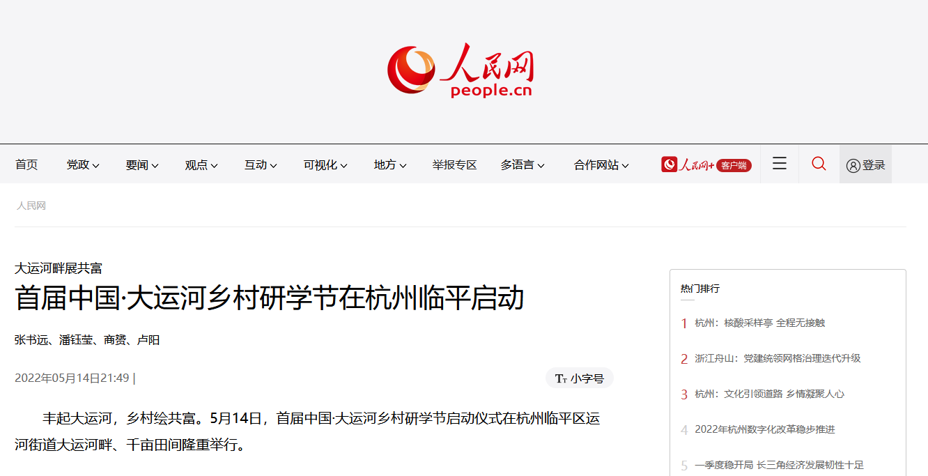 5月14日,人民网刊发《大运河畔展共富首届中国·大运河乡村研学节在杭州临平启动》一文,报道首届中国·大运河乡村研学节启动仪式。关注开元集团人文学院和临平区新宇村共同发布“农文旅设计与运营”研学课程,打造新宇村红色文化和精品路线,推动大运河文化遗产和运河水乡文化的传播。