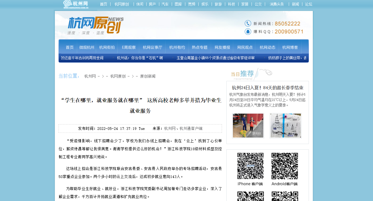 “学生在哪里,就业服务就在哪里。”在疫情防控常态化的背景下,网上求职成为高校毕业生求职的重要方式,如何提高网络招聘实效性也随之成为高校促进学生就业工作的重要一环。浙江科技学院通过浙科微就业公众号、就业信息网等,集纳提供各种信息,学生可以在线查看相关招聘信息、就业指导、全省各地市创业补贴等信息。学校在精准对接需求、开展各类专项活动的同时,通过校企合作、优质企业回访的方式,访企拓岗。浙江科技学院各二级学院通过精准对接,切实帮助学生。