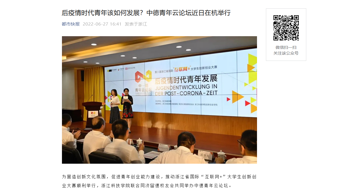 原文链接:都市快报:后疫情时代青年该如何发展?中德青年云论坛近日在杭举行