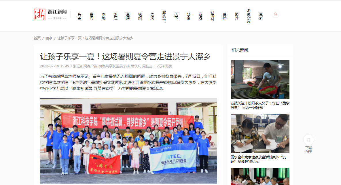 为了有效缓解当地师资不足、留守儿童暑期无人照顾的问题,助力乡村教育振兴,7月12日,浙江科技学院信息学院“e游寻遗”暑期社会实践团队走进浙江省丽水市景宁畲族自治县大漈乡,在大漈乡中心小学开展以“鹰隼初试翼 寻梦在畲乡”为主题的暑期夏令营活动。