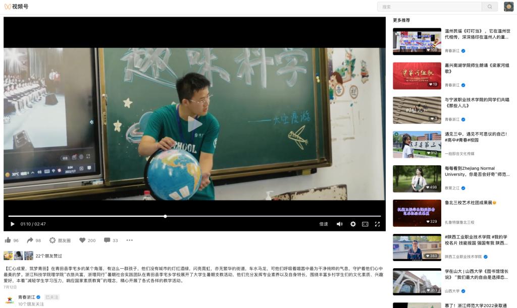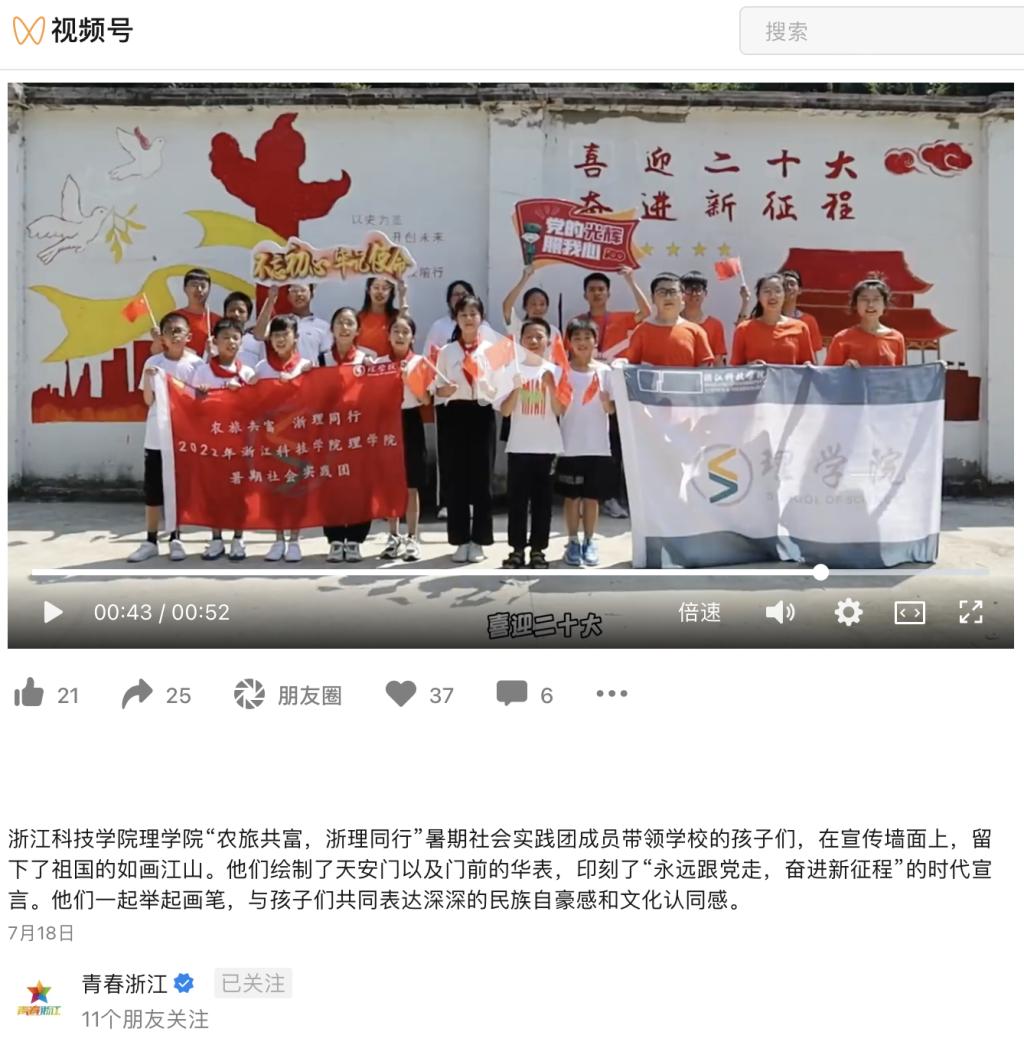 近日,浙江科技学院“农旅共富,浙理同行”暑期社会实践团在青田县季宅乡,开展了大学生暑期支教、以“喜迎二十大,永远跟党走,奋进新征程”为主题的红色教育活动日等实践服务活动。理学院还与青田县季宅乡正式建立“研学基地”。活动受到学习强国、中国共青团杂志·视频号、央视影音、小时新闻、青春浙江·视频号等平台关注。