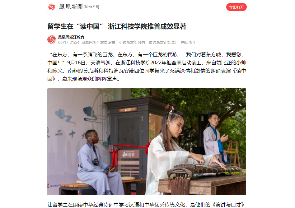 凤凰新闻客户端:留学生在“读中国” 浙江科技学院推普成效显著