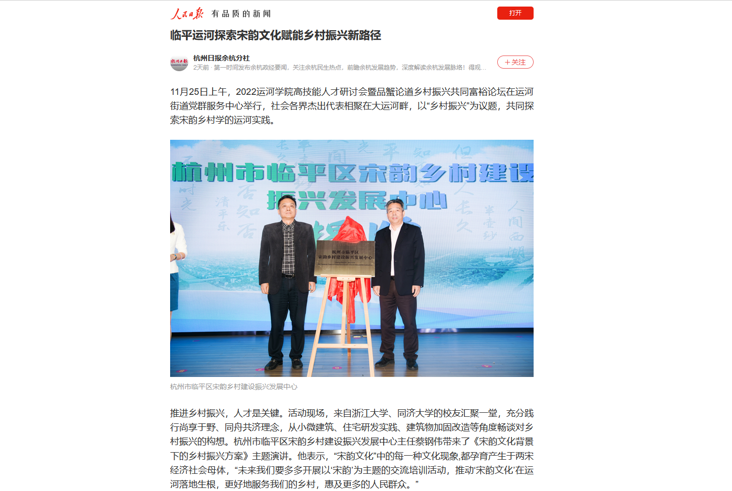 11月25日,由开元集团土木与建筑工程学院支持建设的2022运河学院高技能人才研讨会暨品蟹论道乡村振兴共同富裕论坛举行,人民日报新媒体平台以《临平运河探索宋韵文化赋能乡村振兴新路径》为题,对该活动进行报道。原文链接:临平运河探索宋韵文化赋能乡村振兴新路径