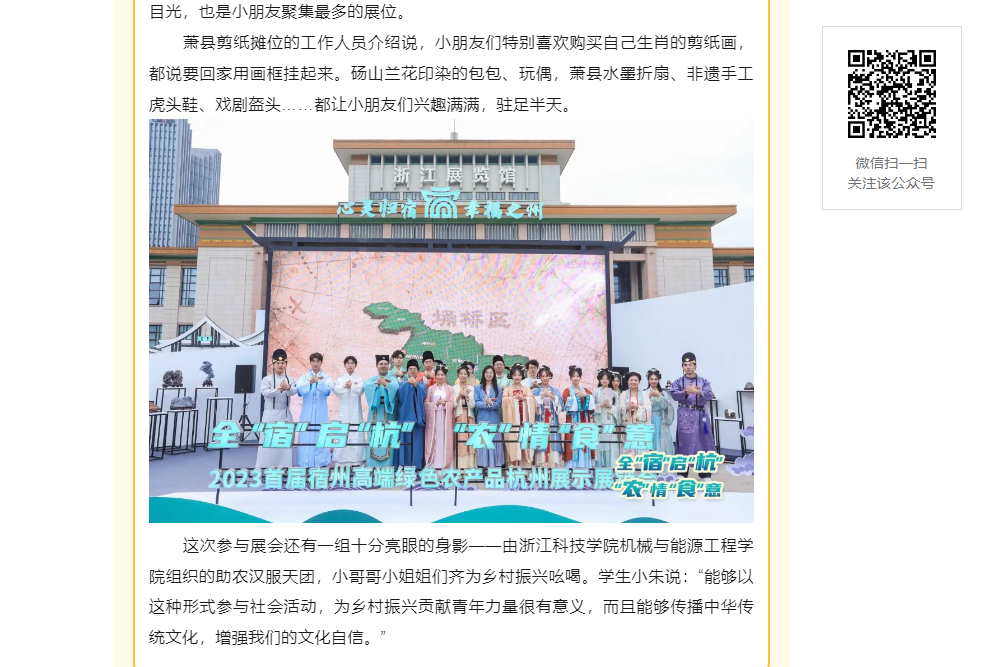 4月28日上午,2023首届宿州高端绿色农产品杭州展示展销会在位于武林广场的浙江展览馆开幕。在展销会现场,由机械与能源工程学院团委组织的助农汉服志愿者团队表现亮眼。一个微笑,一声“你好”,一次指引,一幕留念,一声宣传,20名志愿者热情服务八方宾客,成为了一张靓丽的“青春名片”。助农汉服志愿者们齐为乡村振兴吆喝。