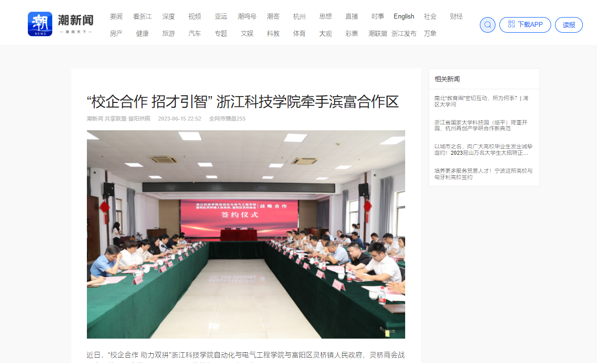 近日,“校企合作 助力双拼”浙江科技学院自动化与电气工程学院与富阳区灵桥镇人民政府、灵桥商会战略合作签约仪式举行。潮新闻客户端、富阳广播电视台等关注此次签约活动。