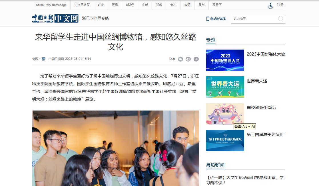 为了帮助来华留学生更好地了解中国灿烂历史文明,感知悠久丝路文化,7月27日,浙江科技学院国际教育学院、国际学生国情教育名师工作室组织来自俄罗斯、印度尼西亚、斯里兰卡、摩洛哥等国家的12名来华留学生赴中国丝绸博物馆参加感知中国社会实践,观看“文明大观:丝绸之路上的敦煌”展览。