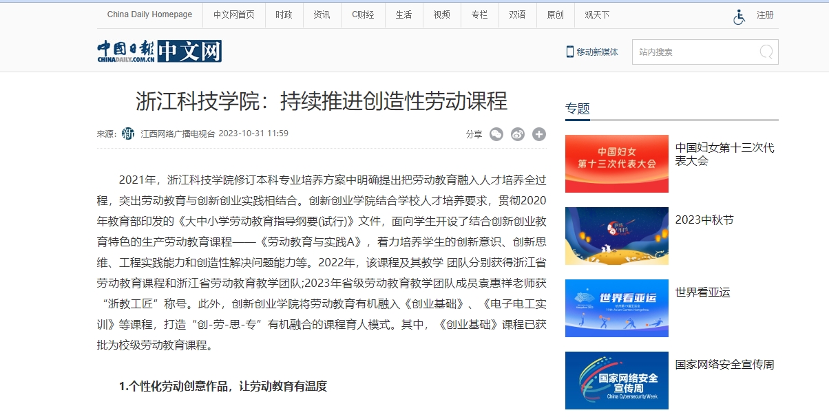 2021年,浙江科技学院修订本科专业培养方案中明确提出把劳动教育融入人才培养全过程,突出劳动教育与创新创业实践相结合。创新创业学院结合学校人才培养要求,贯彻2020年教育部印发的《大中小学劳动教育指导纲要(试行)》文件,面向学生开设了结合创新创业教育特色的生产劳动教育课程——《劳动教育与实践A》,着力培养学生的创新意识、创新思维、工程实践能力和创造性解决问题能力等。2022年,该课程及其教学 团队分别获得浙江省劳动教育课程和浙江省劳动教育教学团队;2023年省级劳动教育教学团队成员袁惠祥老师获“浙教工匠”称号。此外,创新创业学院将劳动教育有机融入《创业基础》、《电子电工实训》等课程,打造“创-劳-思-专”有机融合的课程育人模式。其中,《创业基础》课程已获批为校级劳动教育课程。