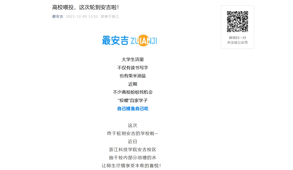 近日,浙江科技学院安吉校区抽干校内部分池塘的水,让师生尽情享受丰收的喜悦!最安吉、浙江消防视频号等对活动进行了报道。