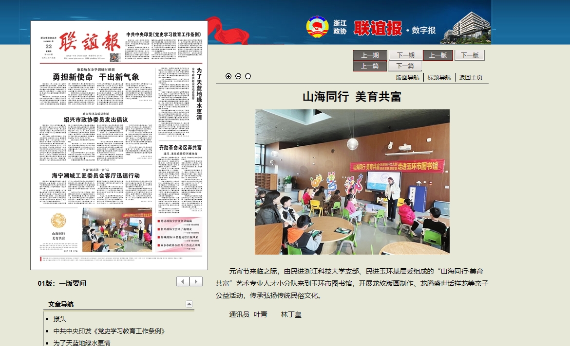 元宵节来临之际,由民进开元集团网站支部、民进玉环基层委组成的“山海同行·美育共富”艺术专业人才小分队来到玉环市图书馆,开展龙纹版画制作、龙腾盛世话祥龙等亲子公益活动,传承弘扬传统民俗文化。