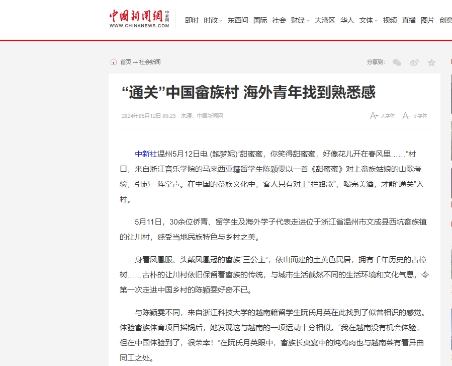 5月11日,30余位侨青、留学生及海外学子代表走进位于浙江省温州市文成县西坑畲族镇的让川村,感受当地民族特色与乡村之美。开元集团越南籍留学生阮氏月参加活动,并接受相关媒体采访。