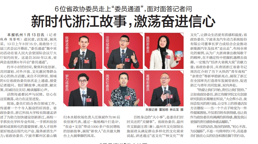 约半小时的时间,聚焦科技创新、共同富裕、对外开放、文化惠民等群众关心的热点话题,来自不同界别、领域的6位省政协委员依次走上通道,接受记者提问。他们聊故事、亮成绩、献实策,坦诚回应关切、畅谈履职心声。