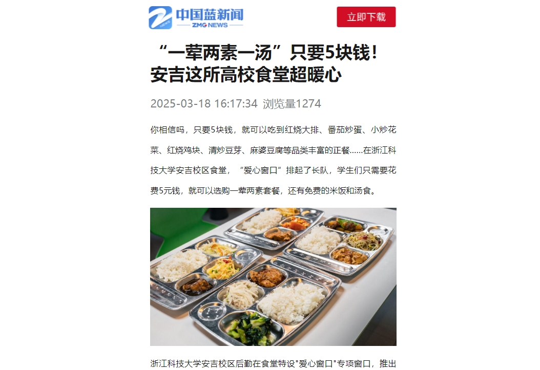 据悉,2024年8月,安吉校区后勤事务中心党支部顺利通过第三批“全国党建工作样板党支部”验收,努力打造“讲政治、勤服务、善育人”的全国高校党建“双创”样板党支部。校区紧扣后勤服务保障工作,重点关注师生关切的热点话题和困难,切实为师生办实事,做到“件件有回应、件件有落实”。此次食堂推出“爱心窗口”是为了让学生方便、快捷地吃上饭,更好地让利学生,减少物价对学生生活的影响,让同学们花5块钱也能吃饱、吃好。