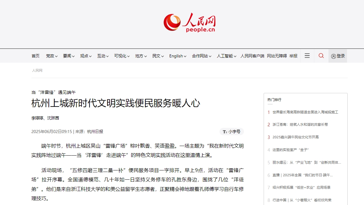 人民网:当“洋雷锋”遇见端午杭州上城新时代文明实践便民服务暖人心