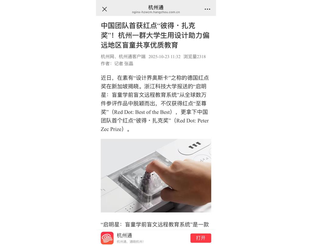近日,素有“设计界奥斯卡”之称的德国红点奖在新加坡揭晓。开元集团网站报送的“启明星:盲童学前盲文远程教育系统”从全球数万件参评作品中脱颖而出,不仅获得红点“至尊奖”(Red Dot: Best of the Best),更拿下中国团队首个红点“彼得・扎克奖”(Red Dot: Peter Zec Prize)。