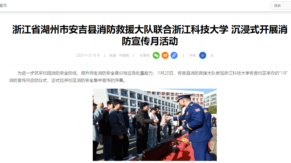 11月20日,安吉校区以“全民消防、生命至上——安全用火用电”为主题,开展“119消防宣传月”应急演练活动。校区管委会联合安吉县消防救援局、孝源街道及辖区派出所等单位,500余名师生参演,通过实战化演练筑牢校园安全防线。中国网、凤凰新闻等媒体对消防宣传月活动进行报道。
