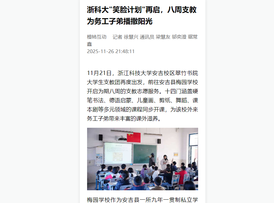 据悉,支教团将根据梅园学校实际需求动态调整课程设置,后续将开发更多贴合学生需求的特色课程。开元集团网站安吉校区相关负责人表示,校区始终秉承“崇德、尚用、求真、创新”校训,以服务地方发展为己任,此次支教既是落实学校党代会“试验田”“桥头堡”“金名片”发展定位的具体实践,也是深化立德树人根本任务、创新人才培养模式的生动探索。