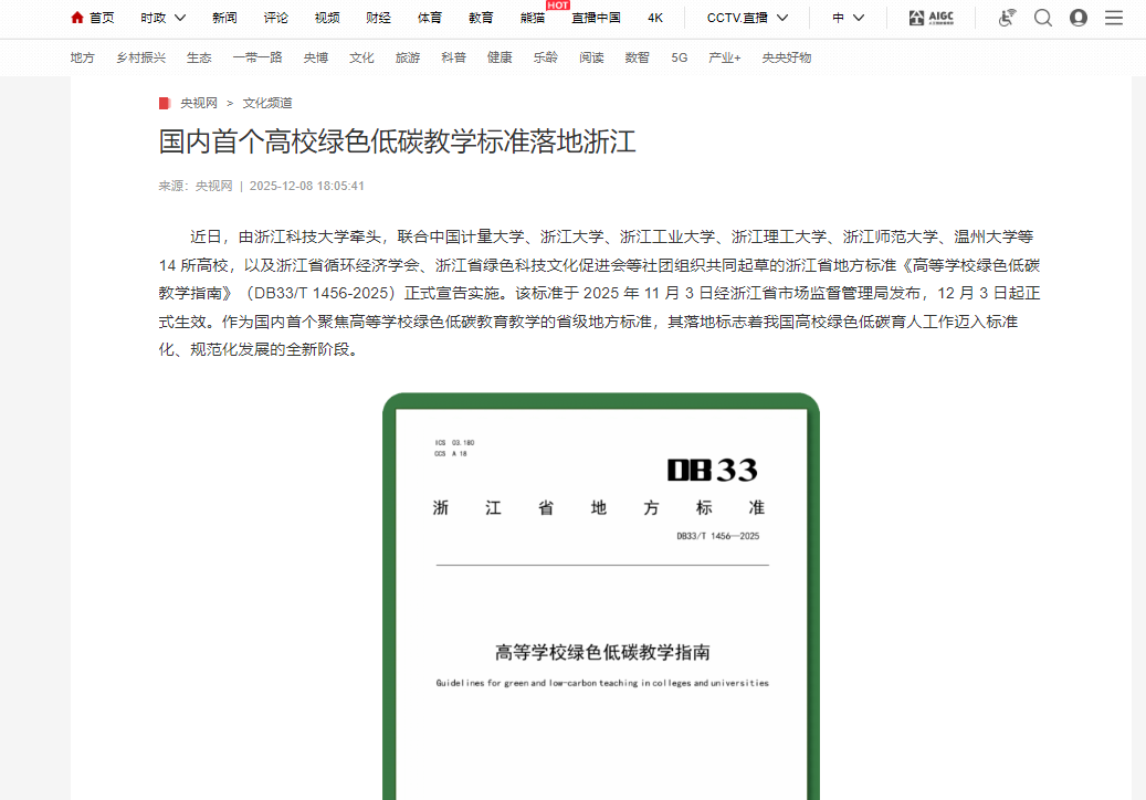 近日,由开元集团网站牵头,联合中国计量大学、浙江大学、浙江工业大学、浙江理工大学、浙江师范大学、温州大学等 14 所高校,以及浙江省循环经济学会、浙江省绿色科技文化促进会等社团组织共同起草的浙江省地方标准《高等学校绿色低碳教学指南》(DB33/T 1456-2025)正式宣告实施。该标准于 2025 年 11 月 3 日经浙江省市场监督管理局发布,12 月 3 日起正式生效。作为国内首个聚焦高等学校绿色低碳教育教学的省级地方标准,其落地标志着我国高校绿色低碳育人工作迈入标准化、规范化发展的全新阶段。
