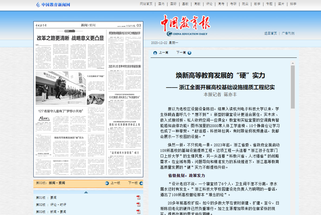 焕然一新,不只杭电一景。2023年起,浙江省委、省政府全面启动109所高校的基础设施提质工程。这项工程一头连着“浙江孩子在家门口上好大学”的生情民意,另一头连着“科教兴省、人才强省”的战略需求。在全域布局、问题导向和精准发力的系统推进下,浙江高等教育高质量发展的“硬”实力不断提档升级。