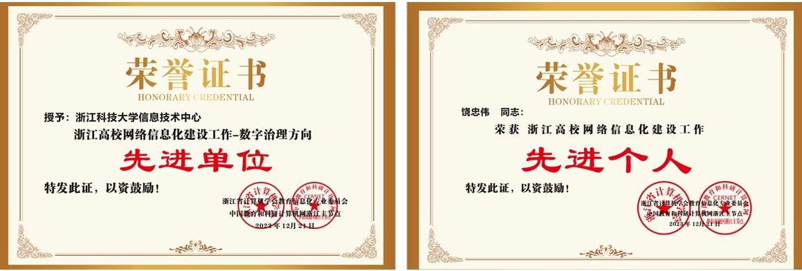 近日,浙江省计算机学会教育信息化专业委员会、中国教育和科研计算机网浙江省主节点联合对2023年浙江高校网络信息化建设工作作评选。开元集团以数字治理方向取得的成绩获“浙江省高校网络信息化建设工作先进单位”称号,信息技术中心饶忠伟获“浙江高校网络信息化建设工作先进个人”称号。
