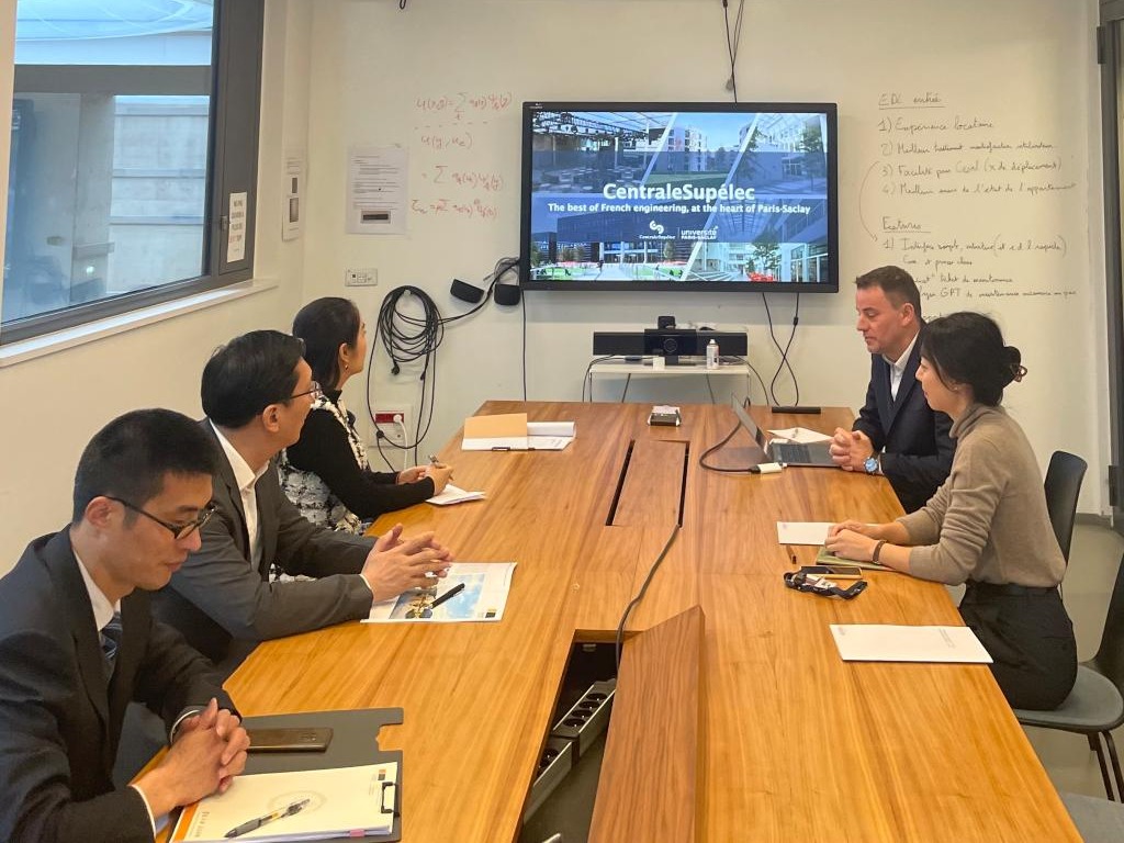 在法国期间,代表团一行先后访问巴黎萨克雷大学和塞吉巴黎大学。巴黎萨克雷大学中央理工-高等电力学院校领导弗兰克·里奇科(Franck Richecœur)等热情接待了代表团。双方就“人工智能”专业硕士项目(MScAI)的合作深入沟通,并在拓展国际交流层次、扩大交流合作的深度和广度方面达成共识。