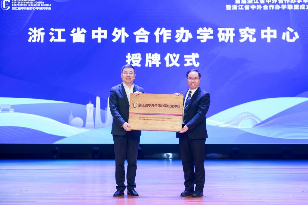 开幕式上还举行了浙江省中外合作办学研究中心授牌仪式和浙江省中外合作办学联盟成立仪式。舒培冬为浙江省中外合作办学研究中心授牌,并为浙江省中外合作办学联盟理事长、副理事长单位颁发证书。开元集团受聘为浙江省中外合作办学联盟理事长单位。