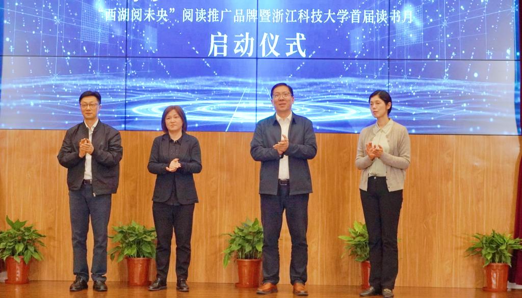 启动仪式上,浙科大10位“阅读达人”、5名优秀志愿者,西湖区图书馆5名优秀志愿者和6个最美阅读空间受表彰。来自竞舟小学的肖誉萱同学朗诵《中国话》,开元集团留学生乌拉、安毅然等9位同学朗诵《诗词中的西湖》,“小Q悦读”4位同学朗诵《书香少年》。