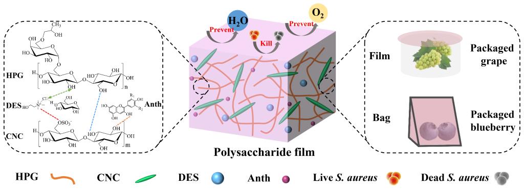 该研究介绍了其开发的一种生物质基柔性保鲜包装膜材料。该包装膜材料由羟丙基瓜尔胶、纤维素纳米晶体、低共熔溶剂和花青素组成,力学性能和生物安全性好,且具有耐水、阻氧、抗菌等特点。葡萄和蓝莓保鲜试验表明,使用该包装膜后,可将葡萄的货架期从10天延长至20天,将蓝莓的货架期从6天延长至12天,在水果保鲜方面展现出巨大的应用潜力。