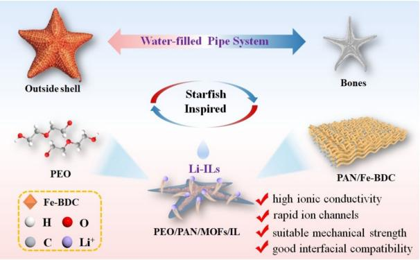 团队针对目前固态锂金属电池(SSLMBs)中的聚合物电解质聚氧化乙烯(PEO)存在的低离子电导率、狭窄的电化学窗口及不足的机械强度问题,从海星的独特结构--柔软外表与坚硬骨架结构汲取灵感,创新性地采用静电纺丝技术,设计出多功能“海星型”复合聚合物电解质(CPEs)。这一设计融合了聚丙烯腈/金属有机框架/离子液体(PAN/MOFs/ILs),构建出三维刚性骨架网络,为锂离子传输形成了连续且高效的传输通道:MOFs赋予骨架刚性,PEO作为缓冲外层提升界面相容性,而ILs则有效降低界面电阻,加速了锂离子的传输。制备的CPEs展现出良好的物理化学性能:优异的离子电导率、宽广的电化学窗口、均匀的锂离子通量以及高迁移数。这些协同优势在Li/CPEs/Li对称电池中得到了充分验证,该电池在1300多小时内展现出优秀的抑制枝晶生长能力。实验证明,在LiFePO4/CPEs/Li全电池应用中,经过2100次循环后,电池容量保持率高达90.1%。此外,通过深入的理论模拟和光谱分析,研究团队系统阐明了多组分固体电解质界面(SEI)的形成机制及其在稳定锂金属循环中的关键作用。这一受自然启发的设计理念,为开发更长寿命、更稳定的固态电解质开辟了广阔的前景,为SSLMBs的进一步发展奠定了坚实基础。