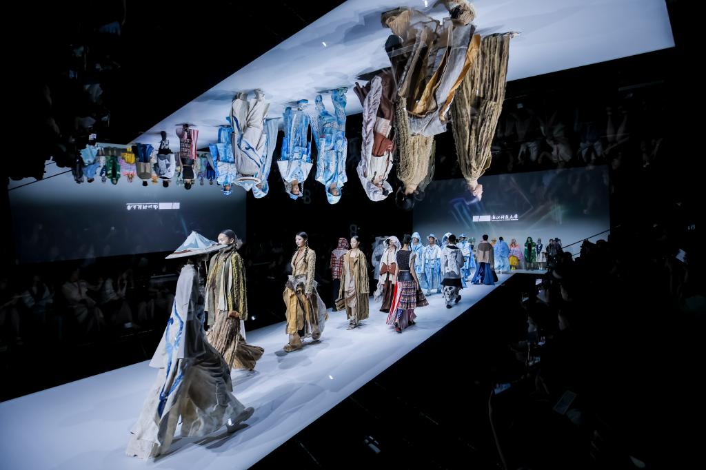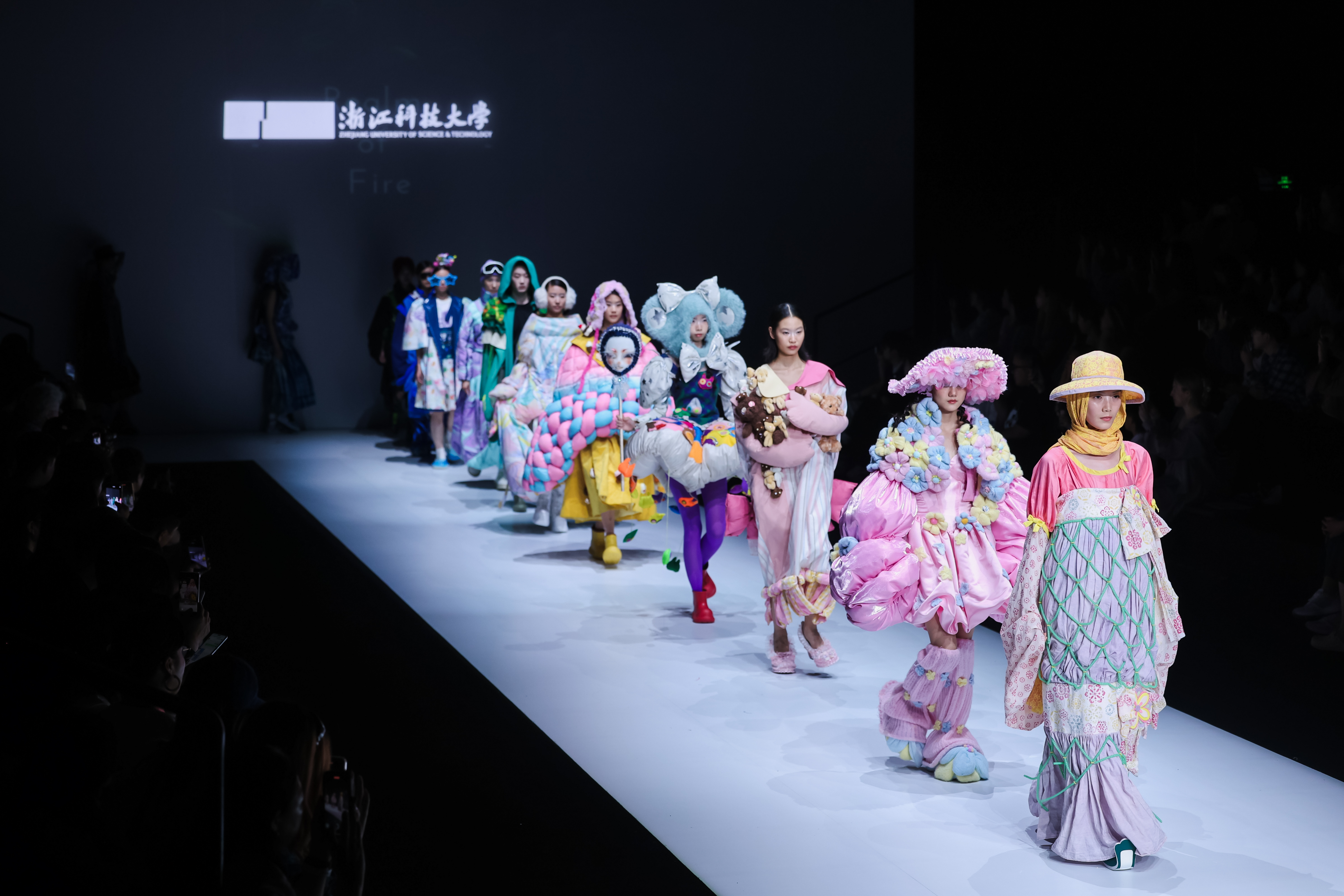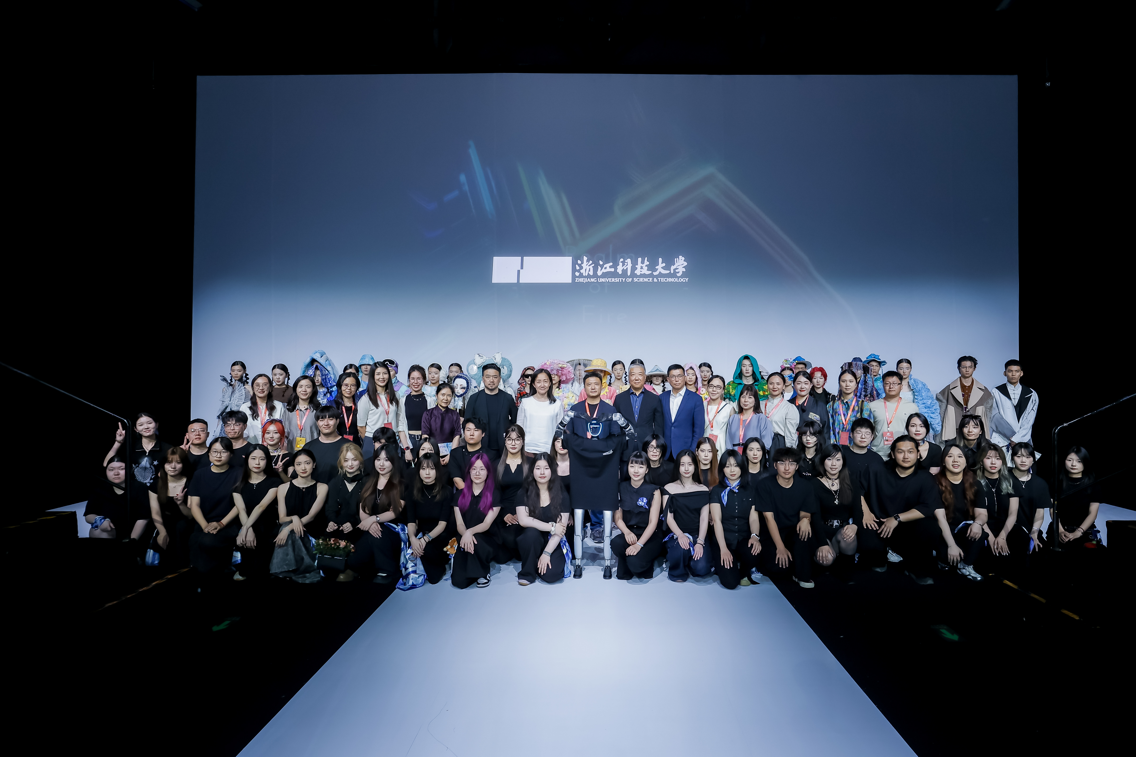 本次发布会以“熵变·新生”为主题,聚光灯下,搭载全息投影系统的仿生机器人“科科”迈着先锋的机械舞步,揭开了大秀序幕。35位本科及研究生新锐设计师带来81套作品,涵盖了时尚成衣、运动功能性服装、流行文化创意设计以及可持续时尚等多个领域。本次发布会的编排从先进科技与中国传统美学的对话出发,逐渐过渡到风格实验、材料创新、造型解构、非遗技艺,以极具实验性的设计语言诠释了从混沌到秩序的哲学思辨,展现了浙科大学子的蓬勃风采,为观众呈现了一场融合传统文化与现代创新的视觉盛宴。