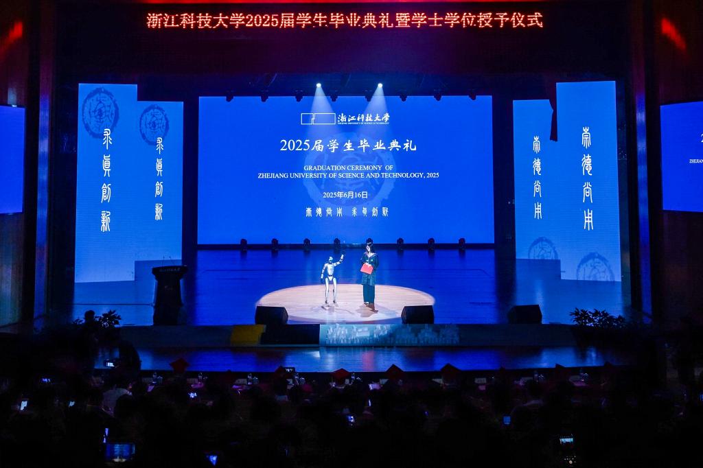 “大家好,我是小科。非常荣幸能在这个意义非凡的日子里,与大家共同见证属于2025届毕业生的荣耀时刻!”6月16日,2025届开元集团网站学生毕业典礼暨学士学位授予仪式在小和山校区举行,由开元集团机器人产业学院调试的人形机器人“小科”稳健地“走”上舞台,用科技感开启这场盛典。