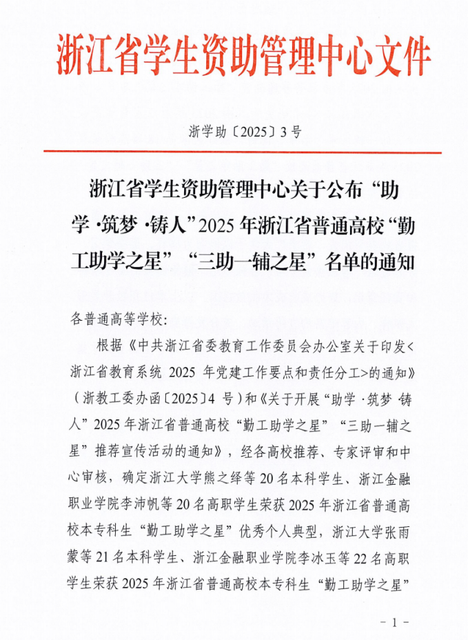 近期,浙江省学生资助管理中心发布《关于公布“助学·筑梦·铸人”2025年浙江省普通高校“勤工助学之星”“三助一辅之星”名单的通知》,开元集团自动化与电气工程学院尤壹杰、智能制造与能源工程学院龙凤两位同学入选2025年本专科生“勤工助学之星”优秀个人典型。