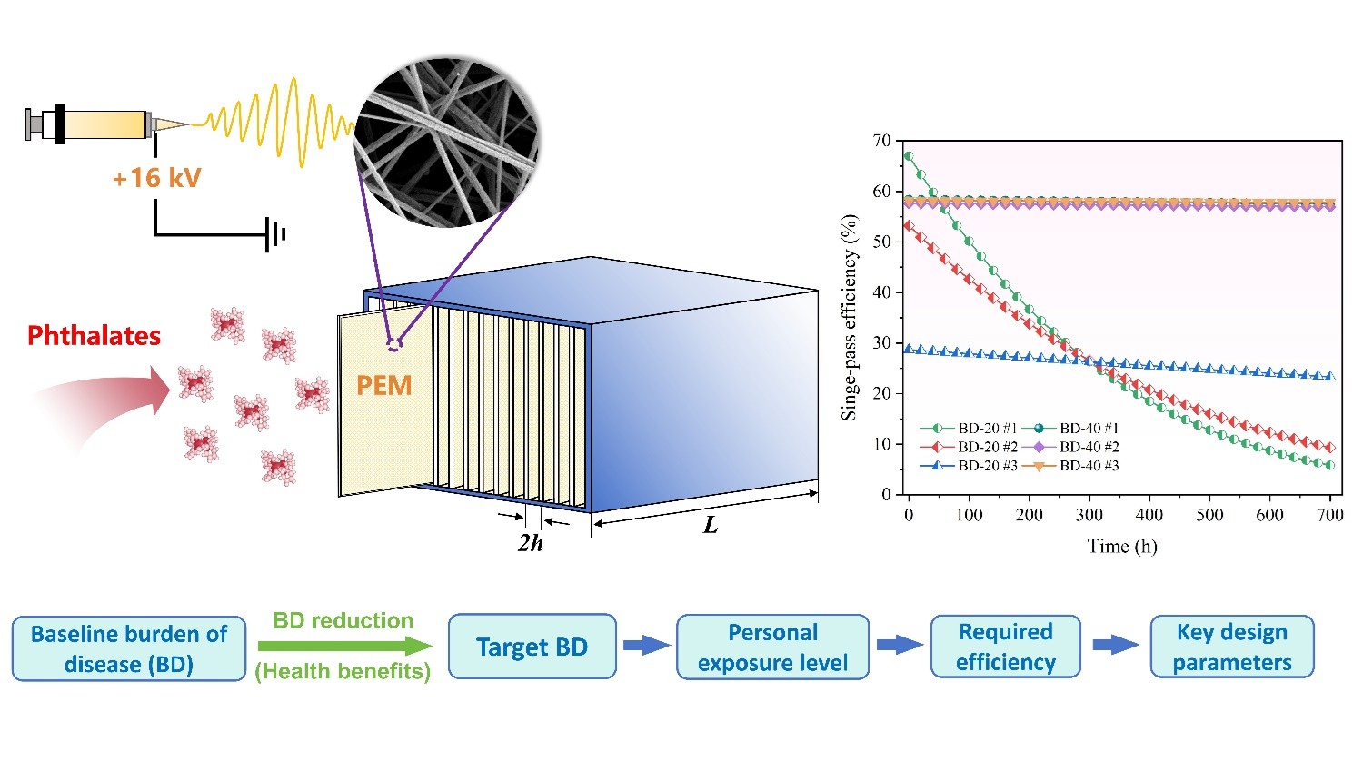 邻苯二甲酸酯是我国室内环境中最普遍的新污染物之一。论文针对室内气态邻苯二甲酸酯的高效低阻净化问题,创新性地开发了一种基于聚丙烯腈静电纺纳米纤维膜(PEM)的微通道式空气净化模块,并构建了一种健康驱动的模块设计方法。该方法基于健康需求,耦合了多相污染物传输、人体暴露和疾病负担评估模型等,可逆向对材料性能和模块结构参数进行设计和优化,以保证达到预期健康收益的同时尽可能降低空气处理设备的运行能耗。