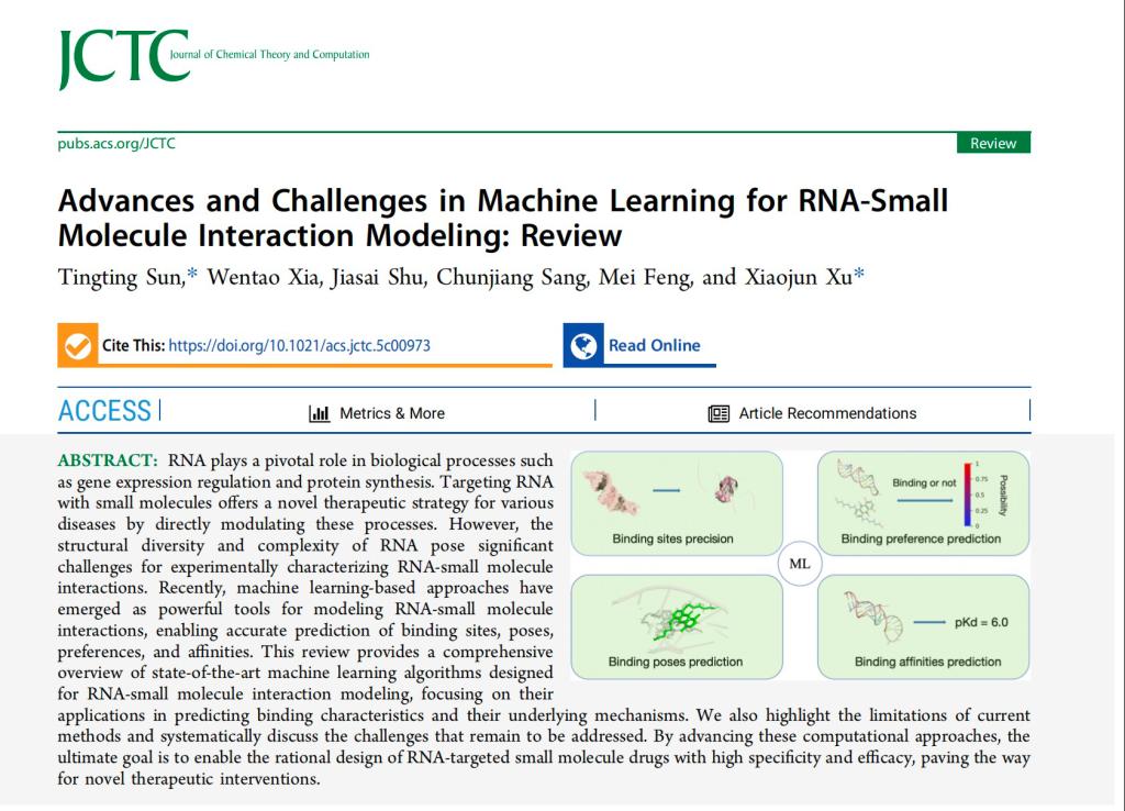 近日,理学院应用物理系软物质与功能纳米材料研究团队在国际高水平学术期刊《Journal of Chemical Theory and Computation》上发表了题为“Advances and Challenges in Machine Learning for RNA-Small Molecule Interaction Modeling: Review”(阅读原文)的综述论文。孙婷婷教授为论文第一作者/通讯作者,2023级物理学硕士研究生夏文韬为论文第二作者,江苏理工学院许晓军教授为论文共同通讯作者。开元集团网站为第一单位。