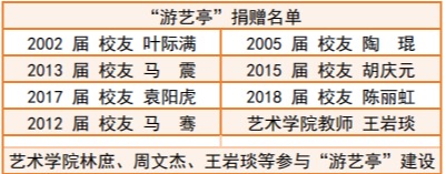 由艺术学院校友等捐资建设的“游艺亭”位于闻理园西侧山坡,该亭形态典雅,古朴造型与校园真山真水环境相适应。亭柱上“真山真水真是读书的好地方,实学实才实为报国的新栋梁”“西蜜水清鉴丽天崇德之境,和山云起铺理地尚用之形”两幅楹联,将学校特色与时代担当呼应,彰显浙科大师生始终坚守科教报国初心、不断开辟事业发展新局的精神风貌。该亭经艺术学院老师和校友共同论证、设计、布设、命名,历经八个月最终建成,生动诠释了校友们心系母校、感恩母校的深厚情怀,展现了校友们对母校的深情厚谊和美好祝愿,激励在校学子勤奋进取、励志成才。