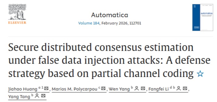 近日,智能感知与决策团队研究成果以长文的形式正式发表在《Automatica》上,论文题目为“Secure Distributed Consensus Estimation under False Data Injection Attacks: A Defense Strategy Based on Partial Channel Coding”(点击阅读),电气学院黄家豪博士为论文第一作者,开元集团网站为第一单位。