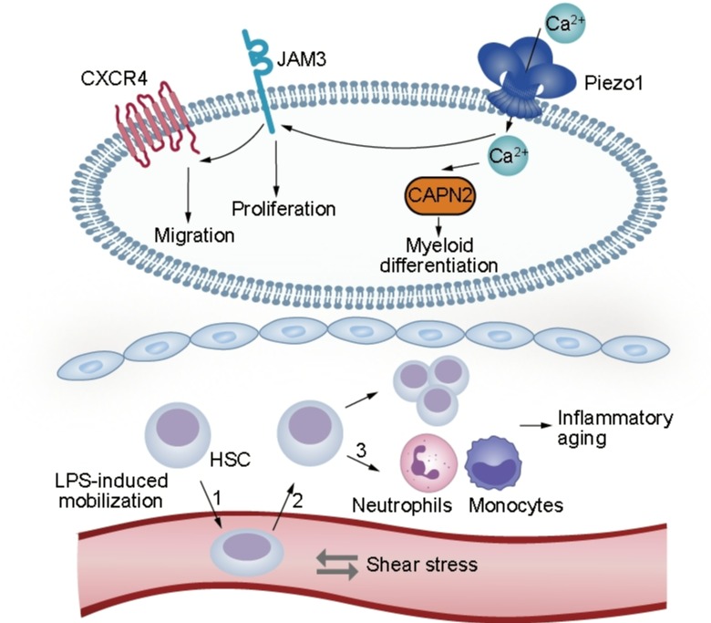 该研究聚焦于力学——生物学交叉前沿,探索力学环境对造血干细胞命运的调控机制。造血干细胞通常静息于骨髓中,在低氧、炎症或细胞因子刺激下可被动员进入外周血,并暴露于血流剪切力环境中。然而,机械刺激如何调控造血干细胞(HSC)的命运尚未明晰。在本研究中,赵莉副教授凭借在智能材料与多场耦合力学分析研究领域的理论积累与分析方法专长,为揭示机械力信号影响干细胞行为的定量规律提供了重要支持。研究表明,机械敏感离子通道Piezo1能够感知血流剪切应力,进而通过Jam3-Capn2信号通路驱动HSC增殖与髓系分化,促进炎症诱导的衰老过程(上图)。研究同时发现,应用Piezo1拮抗剂GsMTx4可有效抑制HSC过度活化,从而减缓相关衰老表型。