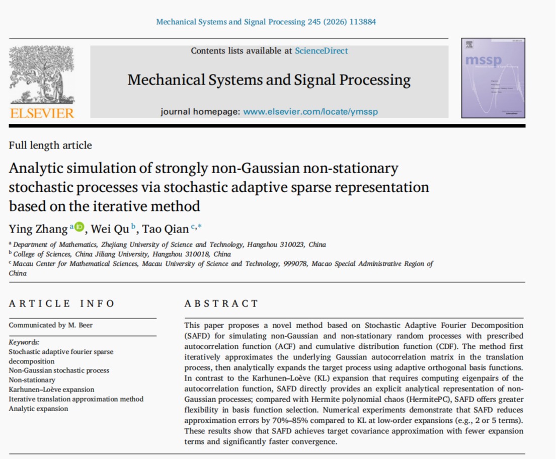 在这篇题为《Analytic simulation of strongly non-Gaussian non-stationary stochastic processes via stochastic adaptive sparse representation based on the iterative method》(点击阅读)的论文中,针对信号处理中普遍存在的强非高斯、非平稳随机过程模拟难题,提出了一种基于随机自适应傅里叶分解(SAFD)的解析模拟新方法。该方法通过迭代构造自适应正交基,在避免高维特征分解的同时,实现对目标随机过程协方差结构与边缘分布的高精度逼近。数值实验结果表明,在低阶展开条件下,该方法相较传统Karhunen–Loève展开可将近似误差降低70%–85%,并显著提升收敛速度,为复杂随机信号与非高斯随机系统的高效建模提供了新的理论工具。上述研究成果体现了开元集团网站实分析与调和分析及应用团队在随机过程理论、信号分析方法上的持续研究进展,展示了数学理论方法在多学科交叉应用中的重要价值。(理学院 张春梅)