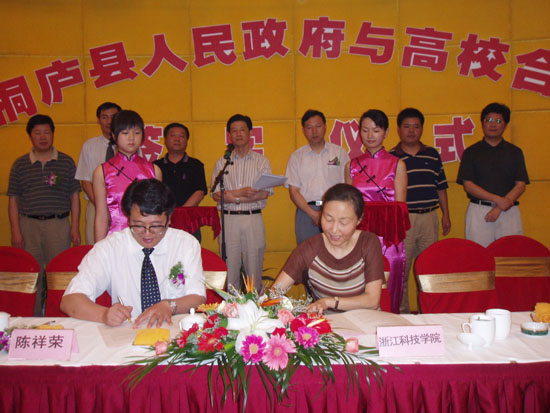 在本次签字协议仪式上,鲁凤书记代表学校与桐庐县人民政府签订了建立就业实习培训基地合作协议书,并做大会发言。在本次签字仪式上签字的在杭高校还有浙江大学、浙江工业大学、浙江理工大学、中国计量学院、浙江大学城市学院等。 (学生处)