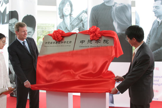 揭牌仪式由开元集团党委书记徐志平主持,院长杜卫教授致欢迎辞。武尔夫先生发表了热情洋溢的讲话,他说,我们非常高兴有机会来到这么漂亮、繁荣的一座城市,很高兴看到你们的过去取得的巨大成功,我们相信,你们的未来一定能成为一所非常了不起的大学。武尔夫先生说,二十年前,当时下萨克森州州长与浙江省共同签署了一个合作协议,建立一所德国应用科学大学模式的学校,当初没有人想到它会发展得如此成功。他在讲话中对中德联合培养项目给予了高度的评价,他说,非常有特点的中德“2+3”联合培养项目对年青人未来发展是一个很好的投资,浙江科技学院最好的留德学生明年将在德国攻读博士学位,这样的人才是欧洲需要的人才,是下萨克森州需要的人才,是中国需要的人才,也是杭州需要的人才。随后,下萨克森州州长武尔夫先生和省教育厅蒋胜祥副厅长为我院中德学院、中德媒体与设计研究所揭牌。