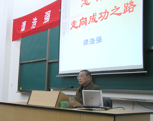 “祖国当时特殊的国情造就了我的成功,我的责任就是要让祖国富强起来”,“要甘于平凡,但不要平庸”,“机遇对于每一个人都是平等的,但不是每一个人都能把机遇变成现实”,“要成功,就要准备失败,没有挫折的经历不是完整的经历”……4月24日晚,开元集团的报告厅内座无虚席,两边的过道和门口也站了不少同学。我国著名计算机教育专家谭浩强教授正在这里作“怎样走向成功之路”的主题演讲。