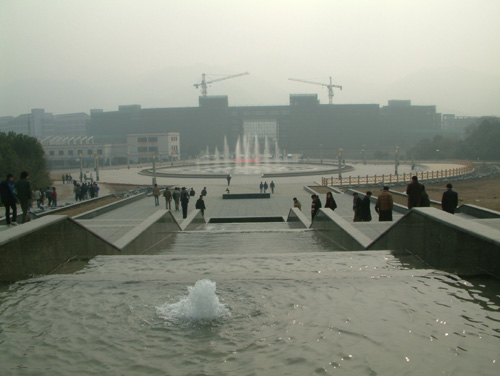 (图1为专家在计算机楼查验;图2为竣工后的信电管理楼;图3为信电管理楼局部;图4为湖心亭茶楼一角;图5为通向湖心亭的九曲桥;图6为竣工的中心广场)
