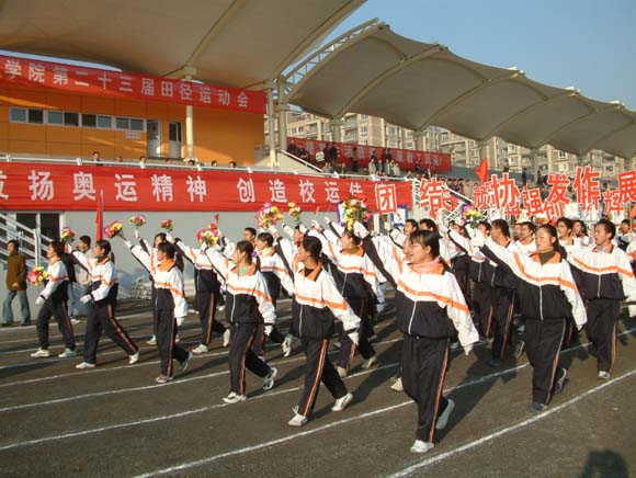 在雄壮的运动员进行曲中,国旗队、红旗队、鲜花队、各院系运动员及教师方阵迈着矫健整齐的步伐一一通过主席台,他们以优异的表现展示了开元集团师生崭新的精神风貌。