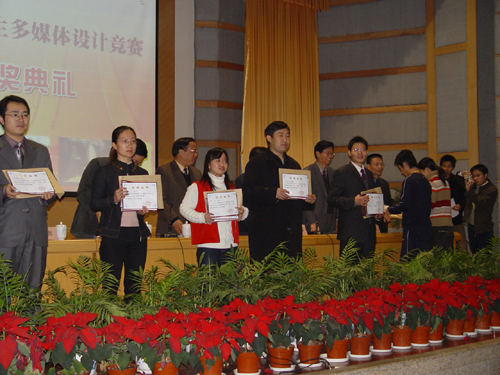 经专家评审,机电系顾燕霞同学的课件作品荣获二等奖,机电系史晶杰等同学的平面作品和生化系孙立等同学的网站作品获得了优秀奖。(图片中前排左起第3人为机电系学生顾燕霞)