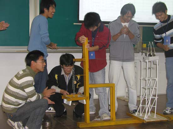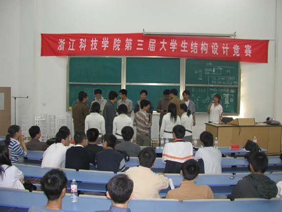 通过评审组专家对各模型设计的理论方案﹑结构造型、制作工艺等认真评审及对各组模型的现场加载比赛。01级土木专业胡徐安、陈少春和李科锋三人的作品,以其独特的构思,精细的制作工艺,合理的结构造型及最高的额载承受能力荣获了一等奖。另还评出了二等奖3组,三等奖6组。