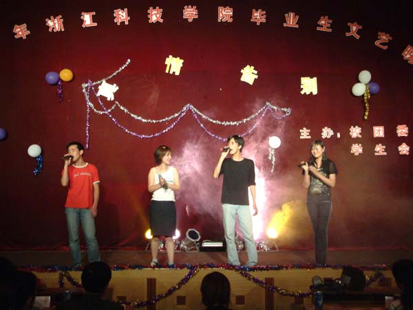一首《过眼云烟》拉开晚会的序幕,歌中透出的淡淡哀伤正如即将离别时那些许的离愁别绪荡开在每一个观众的心头。独唱《枉凝眉》、小提琴独奏《追梦人》、朗诵《那时的日子,这时的离别》……毕业生们以各种形式表达自己对母校的依依惜别之情,师弟师妹也向学长表达自己的美好祝福。校“绿草坪剧社”的演员们也带来了他们特意准备的小品,魔术协会的同学也向师哥、师姐们奉上杂技和魔术,欢笑冲淡了离别的哀伤。“闪亮之星”胡云哲演唱的《有没有那么一首歌》,不禁令人想起同窗数载的深厚情谊,一别之后,兄弟抑或是姐妹,请一路珍重,多年后是否还能再记起我……